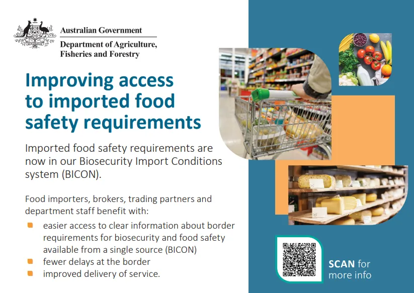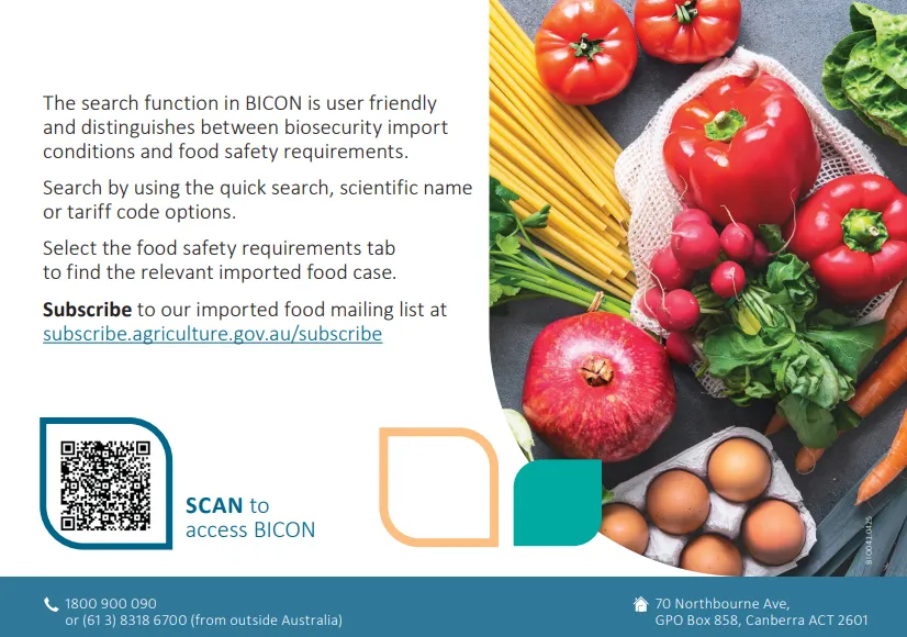 Theo quy định của Australia, sản phẩm thực phẩm nhập khẩu phải đáp ứng các điều kiện về an ninh sinh học, đồng thời phải đáp ứng các yêu cầu về đảm bảo an toàn thực phẩm và các tiêu chuẩn thực phẩm có liên quan. Hệ thống BICON sẽ