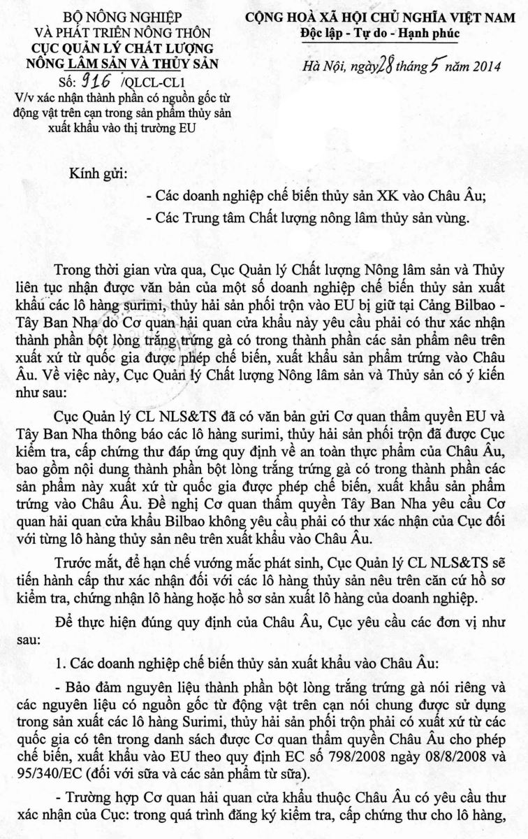 Việc xác nhận thành phần có nguồn gốc từ động vật trên cạn trong trong sản phẩm thủy sản XK EU